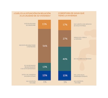 En cuanto a la vivienda, datos de 2023 muestran que el 15% de las casas está en peligro de derrumbe, el 56% necesita reparación y solo el 15% se considera en buen estado.