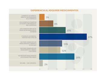 El acceso a medicamentos es igualmente limitado: solo el 3% consigue medicinas en las farmacias estatales, el 13% no puede adquirirlas por la escasez y el 12% por su alto costo. El 15% recurre a envíos familiares desde el exterior y el 8% a organizaciones caritativas.